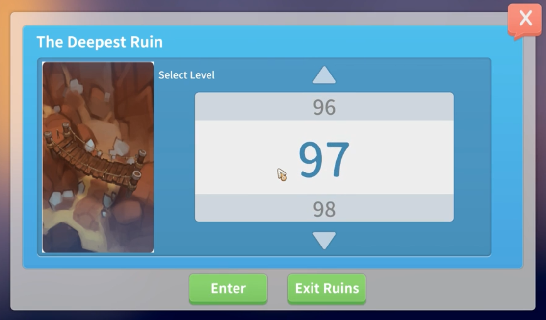 The table below lists enemies the player has a chance to encounter on a given floor and possible rewards for completing it. The majority of the floors in the Deepest Ruin contains higher level versions of regular enemies that can be found on the map or inside other hazardous ruins. Every fifth level contains a boss; in addition, levels 91-100 each contain a boss. All of these bosses, except The Forgotten Knight and Captain Crabbo, can be encountered outside the ruin.