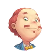 Gale is a rotund, middle-aged man, with a red hair in a receding hairline, a thin mustache at the corners of his wide mouth, and matching soul patch beneath his lips. He has green eyes and thin red eyebrows that are always elevated in a look of almost astonishment. He wears a blue tile-patterned jacket and pink vest over a white shirt and purple pants held up with a black belt. A yellow bow-tie completes his garish ensemble.