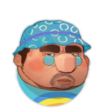 Wuwa, like all of his brothers, is a rather rotund man. He has short, dark hair under a light blue bucket hat with cyan circles and a purple headband. He wears small pince-nez style shades with blue-tinted lenses and has a thin mustache and goatee. He wears his light blue sweater vest emblazoned with the trademark calabash gourd and Hulu name over the top of a yellow short-sleeved shirt with white stripes on the sleeve. His dark blue shorts are patterned with random colourful splotches, and he has black shoes on over his white socks.